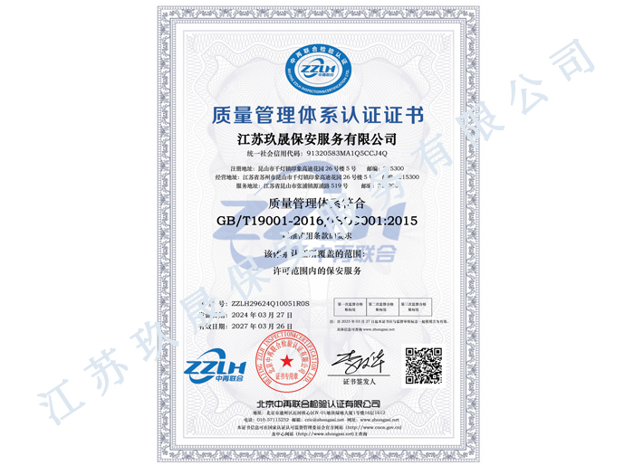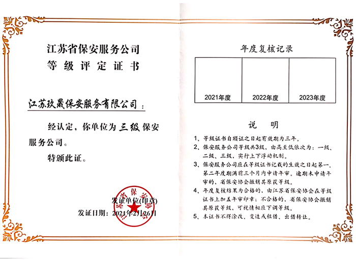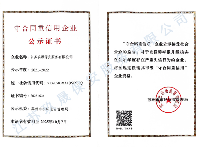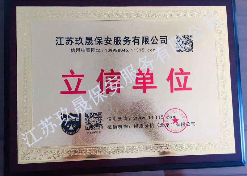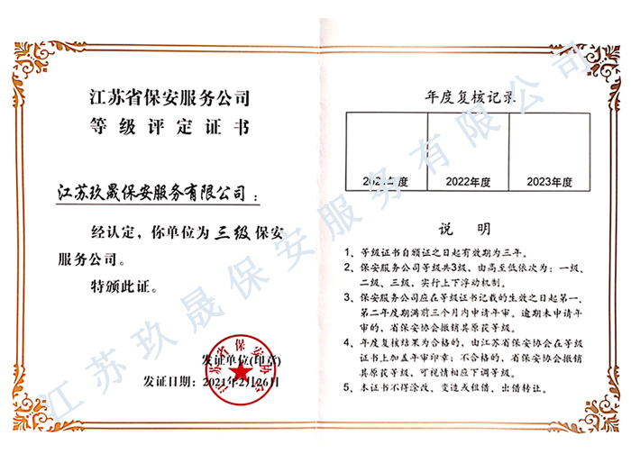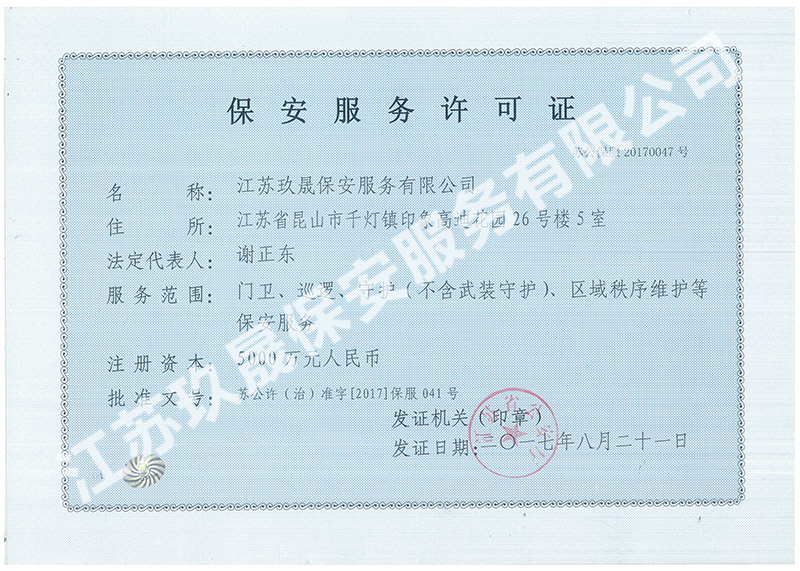 江蘇玖晟保安服務(wù)有限公司成立于江蘇省昆山市千燈鎮(zhèn)。注冊(cè)資金:5000萬,是擁有省公安廳頒發(fā)的保安服務(wù)許可證的企業(yè)【蘇公保服20170046】,也是昆山市保安協(xié)會(huì)常務(wù)理事單位。